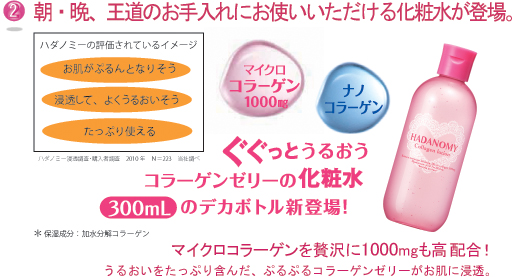 2011年2月7日、ノエビアグループの常盤薬品工業株式会社(本社:東京都港区)は、この度、お肌のために飲ませたい美容成分「マイクロコラーゲン*」を贅沢に高配合したスキンケアブランド「ハダノミー」から、「化粧水」を発売致します。