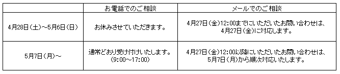 ゴールデンウィーク期間中のお問い合わせにつきまして