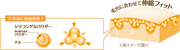 毛穴の形や動きに合わせて伸縮フィットするシリコンゲルパウダーを配合することで、