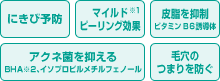 にきび予防 マイルドピーリング効果※1 皮脂を抑制ビタミンB6誘導体 アクネ菌を抑えるBHA※2、イソプロピルメチルフェノール 毛穴のつまりを防ぐ