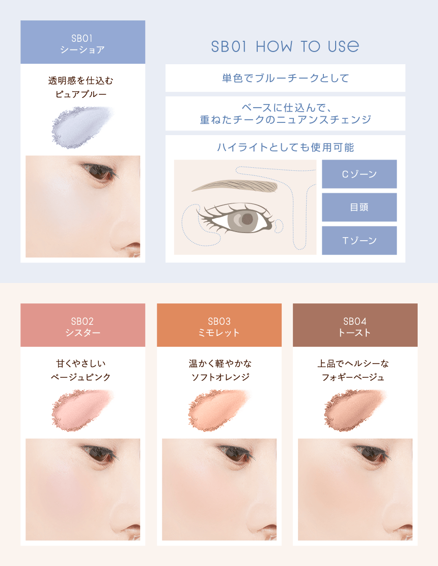 シームレストーン ブラッシュ 5 3件のレビューを見る 送料無料 1,650円(税込) 内容量 - 透明感を仕込むピュアブルーSB01:シーショア 数量 選択12345 在庫状況 : ○ 在庫あり カートに入れる カートに入りましたカートを見る閉じる お気に入りに追加 購入はこちら PAGE TOP previous next アイテム特徴 ほんのりと彩りを添えるソフトな発色 素肌を活かすふんわり発色で境目なく頬になじみ、自然な立体感を演出します。 ピタッと密着してピュアなカラーをキープ 粉っぽさのない密着パウダー処方で透明感のある仕上がりが長時間続きます。 お肌のうるおいを守る美容液成分in 肌当たりやわらかなオリジナルブラシ付き こだわりの斜めカットのラウンド形状で、広く均一に塗りやすいブラシです。 色展開のご案内 使い方 シームレストーン ブラッシュ送料無料 1,650円(税込) 5 3件のレビューを見る 透明感を仕込むピュアブルーSB01:シーショア 数量 選択12345 在庫状況 : ○ 在庫あり カートに入れる カートに入りましたカートを見る閉じる お気に入りに追加 全成分表示 【全色共通】 タルク、トリエチルヘキサノイン、窒化ホウ素、ポリグリセリル−3ポリジメチルシロキシエチルジメチコン、ラウリン酸亜鉛、トリメチルシロキシケイ酸、メチルトリメチコン、ステアリン酸ソルビタン、セラミドNP、スクワラン、ホホバ種子油、オリーブ果実油、トコフェロール、メチルパラベン、(+/−)グンジョウ、マイカ、酸化チタン、酸化鉄、水酸化Al、赤202、赤226 ※商品の改良や表示方法の変更などにより、実際の成分と一部異なる場合があります。実際の成分は商品の表示をご覧ください。 PAGE TOP