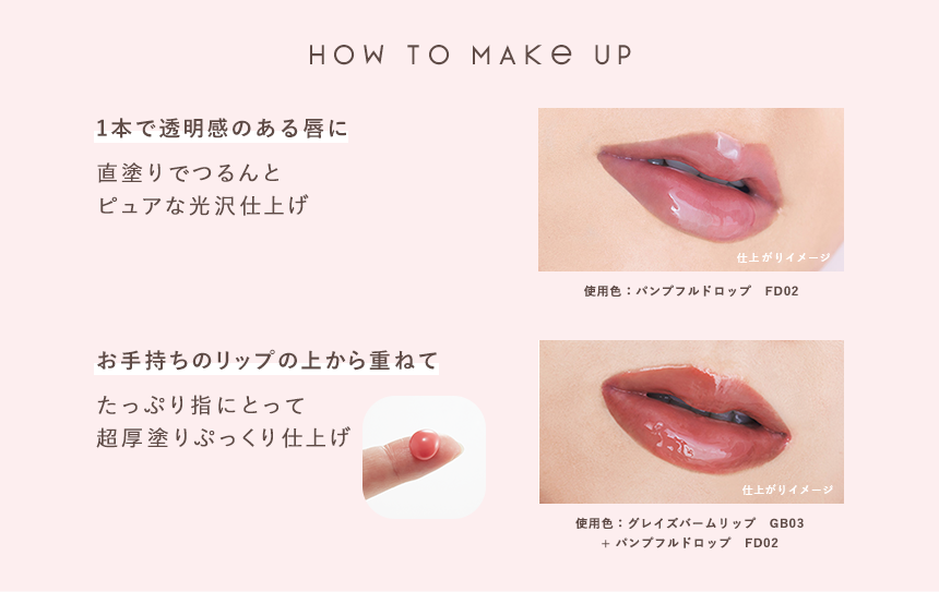 パンプフルドロップ 0 0件のレビューを見る 送料無料 1,760円(税込) 内容量 11g FD01:アプリコットジュレ 数量 選択12345678910 在庫状況 : 〇 在庫あり カートに入れる カートに入りましたカートを見る閉じる お気に入りに追加 購入はこちら PAGE TOP previous next アイテム特徴 厚みのあるテクスチャーで縦じわをカバー立体仕上げのぷるツヤ美容液グロス リップケア成分を贅沢に配合!美容液発想の高保湿リップ 塗りやすさ重視の斜めカットチューブ ほんのり色づくクリアな発色 これ1本でも、口紅の上から重ねても使える 色展開のご紹介 使用アイテム エクセル エシリアル セラムコンシーラー ER03 エクセル モチベートユアスキン MT02※26年3月30日発売予定 エクセル カラーエディットパウダーブロウ EP03 エクセル カラーオン アイブロウ CO01 エクセル リアルクローズシャドウ CX01 エクセル メロウシェード リキッドライナー ML01 エクセル オーラティック ブラッシュ AB02 エクセル パンプフルドロップ FD01 エクセル リップベルベティスト LV02 パンプフルドロップ送料無料 1,760円(税込) 0 0件のレビューを見る FD01:アプリコットジュレ 数量 選択12345678910 在庫状況 : 〇 在庫あり カートに入れる カートに入りましたカートを見る閉じる お気に入りに追加 全成分表示 水添ポリデセン、水添ポリイソブテン、リンゴ酸ジイソステアリル、トリイソステアリン酸ポリグリセリル-2、水添(スチレン/イソプレン)コポリマー、ダイマージリノール酸(フィトステリル/イソステアリル/セチル/ステアリル/ベヘニル)、ジメチルシリル化シリカ、メントール、ヒアルロン酸Na、パルミトイルトリペプチド-1、シア脂、ワセリン、アルガニアスピノサ核油、イソステアリン酸ソルビタン、シメチコン、シリカ、トコフェロール、トリベヘニン、パルミチン酸エチルヘキシル、フェノキシエタノール、(+/−)ホウケイ酸(Ca/Al)、黄4、酸化チタン、酸化鉄、水酸化Al、赤202 ※商品の改良や表示方法の変更などにより、実際の成分と一部異なる場合があります。実際の成分は商品の表示をご覧ください。 PAGE TOP